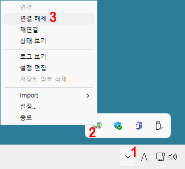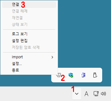 OpenVPN GUI를 실행하고 오른쪽 밑에 ‘숨겨진 아이콘 표시’를 클릭해요.