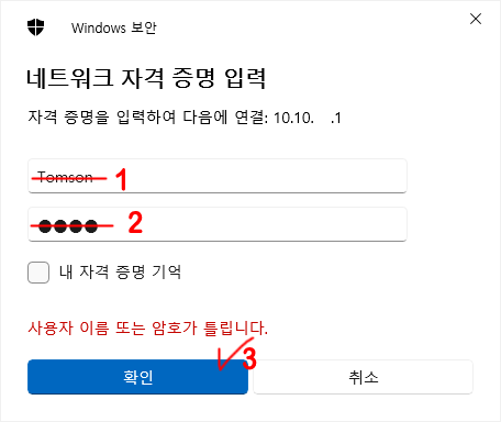 공유폴더를 서비스하는 컴퓨터의 사용자와 암호를 넣고 인증을 해요.