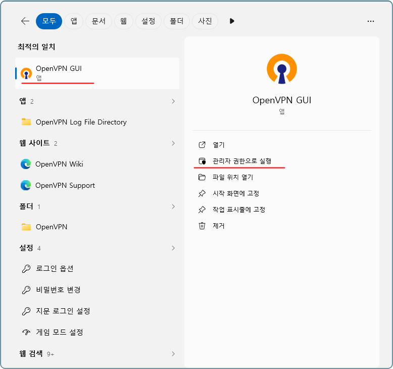 클라이언트 파일을 넣은 후, 한 번은 OpenVPN GUI를 관리자 권한으로 실행해줘요.