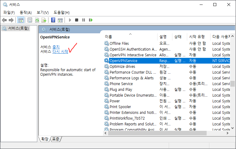 윈도우 서비스에서 OpenVPNService를 ‘다시 시작’해줘요.